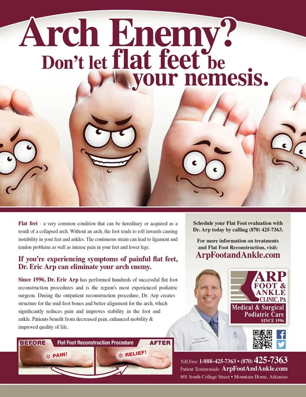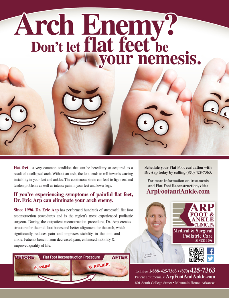 - Plantar Fasciitis—an inflammation on the bottom of the foot that leads to heel and/or arch pain. A variety of foot injuries or improper foot mechanics can lead to plantar fasciitis. Treatments range from icing and foot exercises to the prescription of custom orthotics to correct the foot position and help alleviate pain.